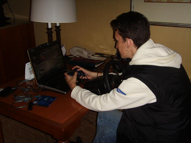 А пока прогеймеры морально готовились к завтрашним испытаниям, часть из них не теряла времени даром, не позволяя упасть скиллам, тренируясь на привезённых с собой ноутбуках. Отдельное спасибо n1ce’у, за то, что он не поленился взять свой Lamborghini-бук, на котором NFS: Carbon просто летал :) Подключив свой Logitech G25 и найсовский Logitech RumblePad2, мы приступили к финальным тренировкам, вкатывая по очереди, в среднем по часу каждый, и в час ночи, с ощущением 100%-ой готовности было решено приостановить тренинг, ведь выспаться перед ивентом тоже не менее важно!